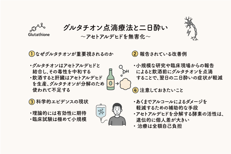 - 臨床エビデンスの現状: 二日酔いの予防・治療目的でのグルタチオンの有効性を検証した、質の高い大規模な臨床研究はまだ多くありません。しかし、一部の小規模な研究や臨床現場からの報告では、飲酒前にグルタチオンを点滴することで、翌日の二日酔いの症状が軽減されたという結果が示唆されています。