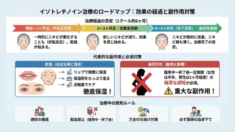 イソトレチノイン治療は、通常1クール(約6ヶ月)かけて行います。飲み始めればすぐにツルツルになる魔法の薬ではありません。事前に「リアルな経過」を知っておくことが重要です。